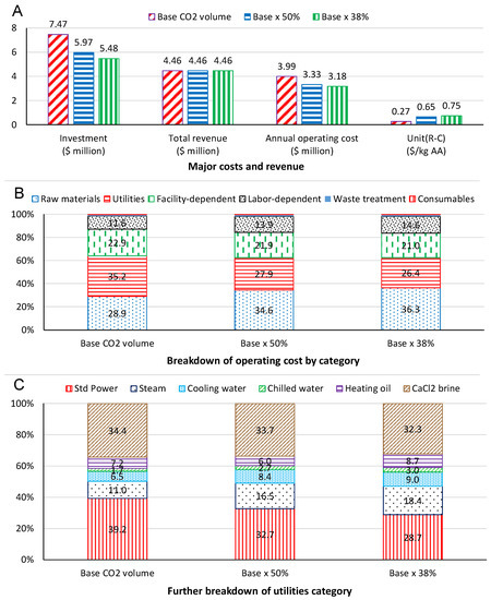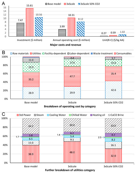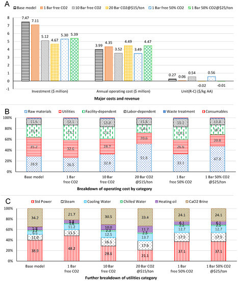 Figure 5B shows the relative percentage changes of each operating cost category for all the five scenarios in comparison with the Base Model, reinforcing that (1) initial compression of a large volume of CO2 is costly in terms of both utilities and facility; (2) the top two utilities cost items are the standard power and CaCl2 brine which are mainly used for CO2 compression and cooling (Figure 5C); and (3) the reduction of CO2 input would significantly increase profit margin. It is noteworthy to point out that the future development of this bio-based technology should consider cascading processing in conjunction with emerging Carbon Capture and Utilization or Recycling (CCU or CCR) technologies that can efficiently provide CO2.