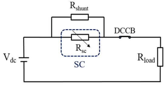 Recently, most SFCL studies for application in DC power systems have been resistive and inductive saturated-iron core types [10,11,12,13,14,15,16]. The equivalent electrical circuit of a resistive type SFCL (R-SFCL) is shown in Figure 1. The R-SFCL is the simplest and most compact SFCL design and directly uses the quench properties of a superconductor. During normal operation, the superconducting coil (SC) carries a normal DC current with zero resistance. In the event of a fault, the current increases rapidly, exceeding the critical current level, causing the SC to quench and increasing the resistance to limit the fault current. The shunt resistor is normally located in parallel with the SC to avoid overvoltage in case the resistance of the SC increases too rapidly after the fault current occurs. However, the quenching process and the temperature rise in the SC can affect and reduce the reliability and stability of the R-SFCL operation. The R-SFCL also requires a superconducting wire long in length and complex design in high-voltage, large-capacity DC power systems.