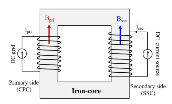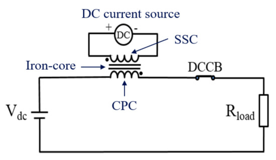 The designed structure of the SI-SFCL described in Figure 4 includes one CPC directly connected to the DC power system, one rectangular-shaped iron-core, and one excitation SSC supplied the current by a DC bias source. The CPC and SSC generate magnetic fields in opposite directions.