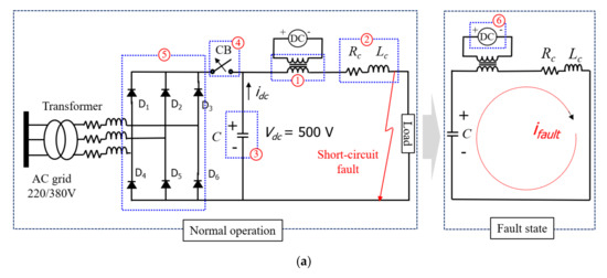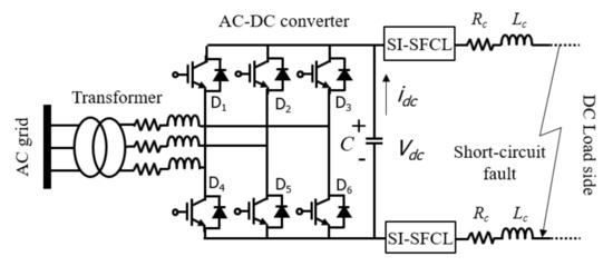 The SI-SFCL is the most widely used inductive type SFCL and has been developed for using in several AC systems [22,23,24,25]. The SI-SFCL in this study was applied to limit the fault current of the VSC-DC power system, as described in Figure 3. When a DC short-circuit fault occurs on the DC side of the VSC, the insulated-gate bipolar transistors (IGBTs) immediately block itself for self-protection. At this time, the capacitor voltage, Vdc, is higher than the peak value of the AC side inter-phase voltage, and the AC side system cannot supply power to the DC side system through the free-wheel diodes due to reverse voltage [20,21,26]. As a result, the DC side system is separated from the AC side, and the AC side current drops to zero. At this state, the DC side can be considered as a circuit in which the capacitor discharges into the short-circuit point. The capacitor discharges rapidly, and the DC current becomes very large, which causes a great threat to the safety of the capacitor and diodes. However, the installed SI-SFCL can reduce the fault current level, as well as the discharge of the capacitor, and the DC power system will be safe. Then, the breaking capacity of the DCCBs could be reduced.
