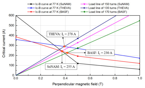 The number of turns for the CPC was calculated to be 198. The SSC is designed so that the fault current limit rate of the SI-SFCL approaches 70%. The fault current limit ability of the SI-SFCL was verified through the PSCAD/EMTDC simulation model. A FEM model was developed to analyze the magnetic flux density of the SSC and estimate its critical current. The operating current of the SSC was determined with a safety margin of at least 20%. The critical current of the SSC depends on the magnetic flux density in the perpendicular direction of the wire surface. Therefore, the critical current was estimated by comparing the value of the perpendicular magnetic flux density and the Ic-B curves of the 2G HTS wires, as shown in Figure 5. As a result, the number of turns of the SSC with the A1, A2, and A3 wires was determined to be 150, 135, and 170 turns, respectively. Accordingly, their operating currents were 200 A, 220 A, and 230 A. The detailed specifications of the SSCs using these three kinds of 2G HTS wires are described and compared in Table 3.