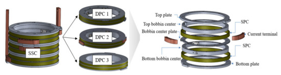 With the same shape, inner radius, safety margin of the operating current, and fault limiting performance, the SSC with the A1 wire exhibited the lowest wire cost; thus, wire A1 was chosen. Circular-shaped double pancake coils (DPCs) were applied to the SSC, and three DPCs were used. Each DPC consisted of two single pancake coils (SPC). The number of turns of one DPC was 50. The height, inner and outer radii of the SSC were 105.6 mm, 92 mm, and 97.5 mm, respectively. In the fault event, the high voltage and current induced into the SSC can damage the SSC and DC bias source and affect the fault limiting performance of the SI-SFCL. Thus, in order to protect the superconducting coil from these factors, the SSC was wound on the anodizing aluminum bobbin with turn to turn Kapton insulation. The aluminum bobbin applied to the SSC is like a shield that isolates the SSC from the magnetic flux change in the iron-core during the fault condition; thus, it can reduce the induced current and voltage in the SSC. Figure 6 describes the detailed structure of the designed SSC for the lab-scale SI-SFCL.