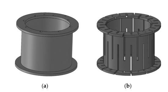 Since the number of turns of the CPC was determined in the previous section, in this section, we discuss how the structure and bobbin design of the CPC were implemented, and analyze its effects on the fault limiting performance of the SI-SFCL. The design of the CPC also aimed at achieving the required performance and reducing the cost of the SI-SFCL. Based on the cost and mechanical properities of the materials, we investigated three kinds of bobbins for the CPC: Al-solid, Al-cutting, and GFRP bobbins. We suggested the cutting bobbin to reduce the dimension of the circulating path of the eddy current in the aluminum bobbin, thereby reducing the eddy current loss. In the case of the GFRP bobbin, there is no eddy current loss, but there is a problem in that its material cost and manufacturing cost are high. Figure 7 shows the structure designs of the solid and cutting bobbins used for the CPC.