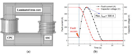 3D FEM simulation model of the SI-SFCL: (a) 3D graphic model; and (b) Fault current without SFCL operation.