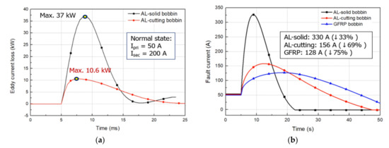 Figure 9 describes the fault current limit characteristics of the SI-SFCL with three kinds of CPC bobbins in the FEM simulation. The GFRP is a non-conductive material, so there is no eddy current loss in this bobbin. Therefore, the eddy current loss of the bobbin under the fault condition was only analyzed with the Al-solid and Al-cutting bobbins as shown in Figure 9a. The high eddy current loss significantly reduced the fault current limit ability of the SI-SFCL. This problem can be solved by cutting the aluminum bobbin, and as a result, the eddy current loss was much lower than that of the Al-solid bobbin. Obviously, the CPC using the GFRP bobbin without the eddy current loss was able to limit the fault current most effectively as shown in Figure 9b.