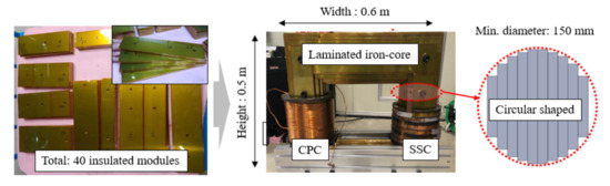 Figure 10 describes the designed structure and fabrication of the iron-core system for the lab-scale SI-SFCL. The iron-core was designed to minimize the core losses, including the eddy current and hysteresis losses, during the transient fault. Such core losses cause a high reluctance path to the magnetic field and magnetic energy losses, reducing the fault limiting ability of the SI-SFCL. The iron-core constructed from thin silicon steel lamination, which has high permeability, can reduce these unwanted losses. The resistivity of the silicon steel is high, and these steel laminations were insulated from each other by a thin Kapton tape layer, thereby increasing the overall resistance of the iron-core to prevent the flow of the eddy current. The non-oriented silicon steel 50PN470, which can be saturated at 1.6–1.7 T, was chosen for the iron-core design. The circular-shaped core was implemented to reduce the coil area, which, in turn, reduces the wire length and cost of the coil system.