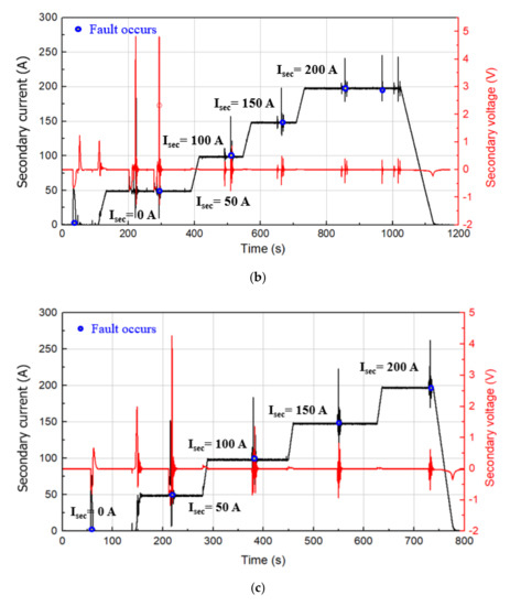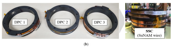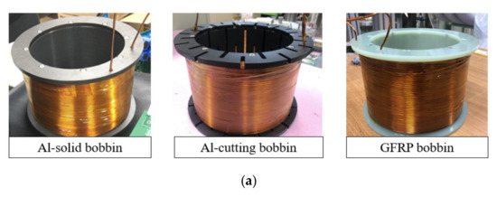 Figure 11a describes the fabrications of the CPCs with the three bobbin types. We used the enameled copper wire for the CPC, and its diameter was 2.8 mm. The height, inner and outer radii of all the designed CPC were 140 mm, 90 mm, and 112 mm, respectively. The CPC was wound on the bobbin with four layers, and the number of turns in each layer was 50. The SSC with three DPCs was wound and fabricated as shown in Figure 11b. Before testing the SI-SFCL under the fault condition, the designed parameters and operating characteristics of the iron-coreless CPC and SSC were first confirmed.