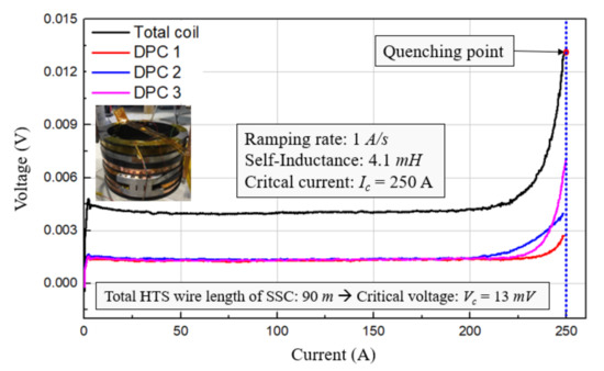 In addition, we confirmed the operating characteristics of the SSC at an operating temperature of 77 K, as shown in Figure 12. The self-inductance and critical current of the SSC are measured to be 4.1 mH and 250 A, respectively. With the operating current of 200 A, the safety margin of the SSC is 20%.