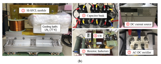 Experiment circuit for the performance test of the lab-scale SI-SFCL: (a) Equivalent circuit of the fault current testing; and (b) equipment of the testing system.