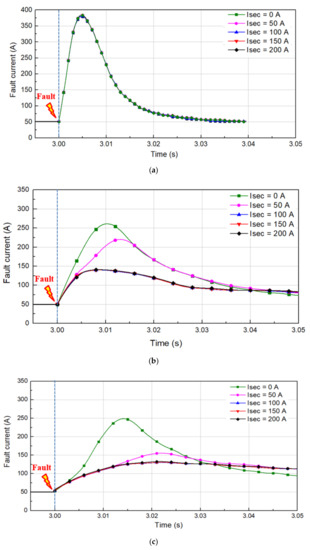 In the experiment, we tested the SI-SFCL operation under the fault condition with different operating currents of the SSC and three kinds of CPC bobbins, as shown in Figure 14. The operating current of the SSC was increased from 0 A to 200 A, with a step of 50 A. The designed operating current of the SSC was 200 A. In the case of using the Al-solid bobbin, the fault current limits of the SI-SFCL were the same for all operating currents of the SSC as described in Figure 14a. The SI-SFCL only reduced the magnitude of the fault current by 24%. This result was similar to the FEM simulation result, which showed that the high eddy current loss of the Al-solid bobbin significantly reduced the fault current limit ability of the SI-SFCL. In Figure 14b, using the Al-cutting bobbin, the fault current limit showed a great improvement. The SI-SFCL more significantly limited the fault current when increasing the operating current of the SSC. With the SSC current being higher than 100 A, the SI-SFCL decreased the fault current level to 140 A, increasing the limitation rate up to 72%. As a result, the SI-SFCL using the GFRP bobbin in the CPC achieved the highest performance in terms of the fault current limit due to no eddy current loss. The fault current limit rate in this case was 73.6%; however, it was only slightly higher than that of the Al-cutting bobbin.