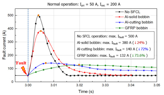With the SSC operating current of 200 A, the fault current limits of the SI-SFCL using three kinds of CPC bobbins were compared as shown in Figure 15. Using the GFRP and Al-cutting bobbin in the CPC, the SI-SFCL achieved the design target, which was the fault limitation rate of 70%. However, there was a difference in the rising of the fault current di/dt between them. In the case of using the Al-cutting bobbin, the rising of the fault current was faster than that of the GFRP bobbin, because it still had a small eddy current loss. However, this could be solved by making more cuts on the bobbin. The slower rising of the fault current allows for more time for the DCCB operation.