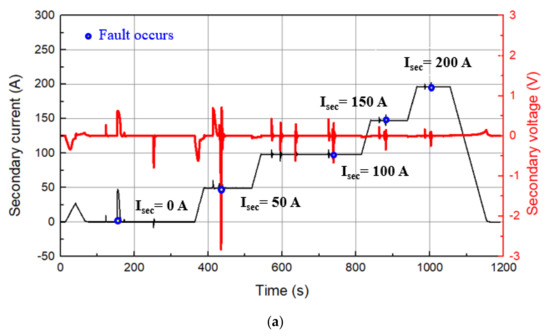 The Al-solid bobbin significantly reduced the inductance of the CPC and the fault current limit ability of the SI-SFCL, thus reducing the flux change in the iron-core. Therefore, the induced current and voltage in this case were very small, as shown in Figure 16a. As a result, the GFRP bobbin caused the highest induced current and voltage in the SSC. The detailed measured results of the maximum current and voltage in the SSC with three kinds of CPC bobbins during the fault tests are summarized in Table 6.