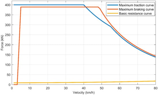 The external characteristic curves (max force) of train traction and braking force are shown in Figure 2, and Equations (2), (4), and (6) are examined by the actual experiment from Qingdao Metro Line 6.
