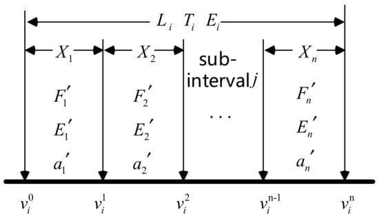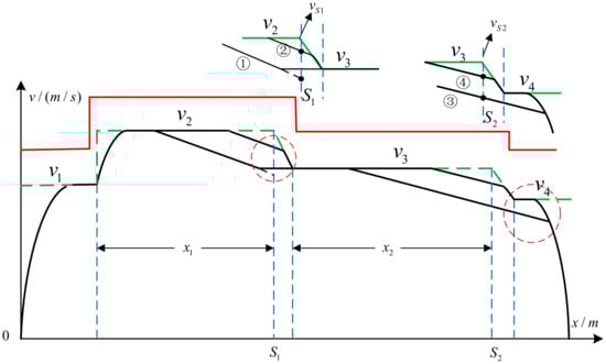 As shown in Figure 3, because of the speed limit, the operation of the metro on the entire line is divided into intervals, where represents the starting speed of the train in the interval, , and it also represents the ending speed in the interval, ; and and represent the starting speed and the arrival speed, respectively; obviously, .