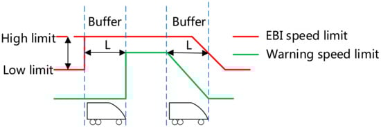As shown in Figure 8, when the train moves from the low-speed-limit zone to the high-speed-limit zone, the train needs to reserve a buffer equal to the length of the train. When the train moves from the high-speed-limit zone to the low-speed-limit zone, the same buffer is required.