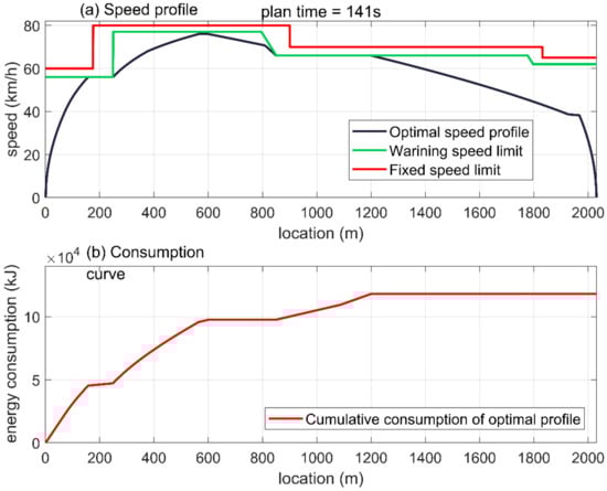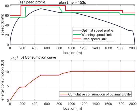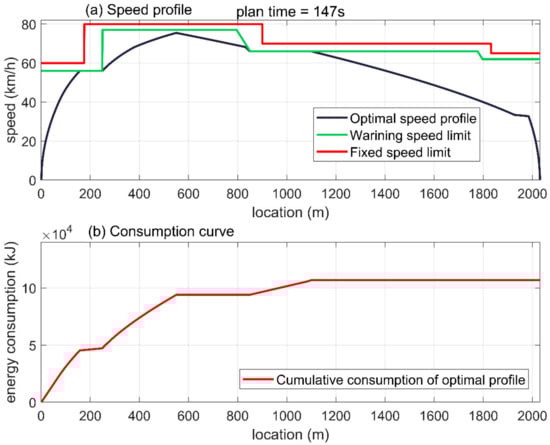 Optimal speed profile. (a) The optimal speed profile made by optimization; (b) Cumulative energy consumption growth curve.