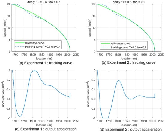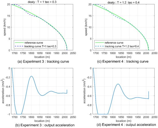 As shown in Figure 19a,c and Figure 20a,c, after a period of adjustment, the tracking curve can always converge to the reference curve. As shown in Figure 19b,d and Figure 20b,d, when the time delay becomes larger, the system applies more acceleration to keep it tracked. As a result, in all the given cases, the system has achieved accurate tracking. Since the time delay of the actual system generally does not exceed 0.9 s, the sliding mode controller is considered effective for the compensation of the known fixed time delay.