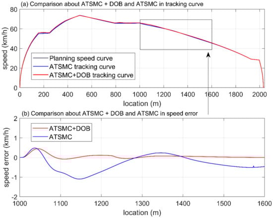 Recently, sliding mode control is becoming a research hotspot. Because it is easy to design and did not require accurate parameter identification, it has been used in actual physical systems, such as power systems and industrial robot manipulators [,,]. In addition, the controller with a nonlinear sliding surface has been proven to converge in a limited time []. Especially for the adaptive terminal sliding mode controller (ATSMC), in addition to the advantages of fast convergence, it can also be adaptive to the internal parameter disturbance and external interference of the system []. Inspired by the above articles, we introduce the additional resistance caused by slope and the basic running resistance of the train into the sliding mode controller, in the form of disturbance, and an adaptive terminal sliding mode controller for train-speed-tracking control (ATSMC) is designed in this paper. In order to further suppress the disturbance and enhance the control accuracy, which are important to energy saving, comfortableness, and punctuality, this paper introduces a disturbance observer (DOB) on the basis of ATSMC to track the speed profile; finally, ATSMC+DOB is designed, and the convergence is proven by Lyapunov theory.