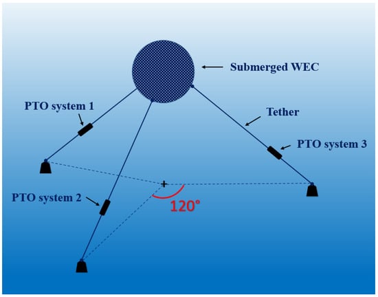 In this study, a CETO6 wave energy converter with a three-tethered mooring system is considered which has a fully submerged spherical buoy attached to the seabed by the tethers, as shown in Figure 1. This model is developed in MATLAB and was modified in 2020 [59]. The WEC details are: buoy radius = 5 (m), submergence depth = 3 (m), water depth = 50 (m), buoy mass = 376 (t), buoy volume = 523.6 (m), tether angle = 55 (degree), PTO stiffness = 2.7 × 10 (N/m), PTO damping= 1.3 × 10 (Ns/m).