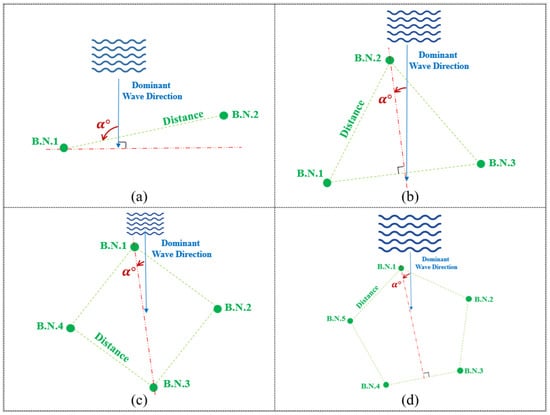 Layout Setup of (a) 2 buoys array (linear), (b) 3 buoys array (triangle-shape), (c) 4 buoys array (square-shape) and (d) 5 buoys array (pentagon-shape), with regard to dominant wave direction.