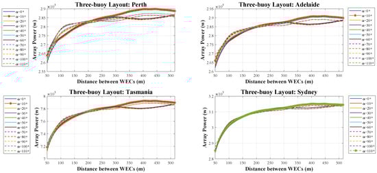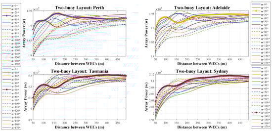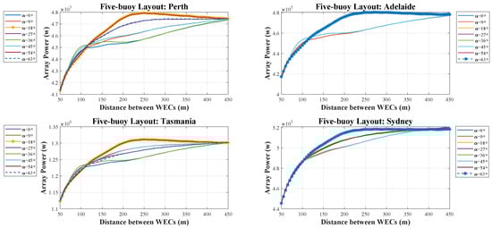 It can be seen that in Figure 5, the most obvious inferred outcome is that, the longer distance between WECs leads to more extracted power output. However, widening the area might not be proficient because the line only rises 0.2 Mw by increasing the distance from 250 to 500 m. The maximum harnessed power output can be seen when is 10 degrees, except in Sydney, which is 110. The range of array power is quite narrow in the mentioned locations, where only a 0.05 Mw gap can be witnessed among 12 tested angles. The main reason for obtaining the similar results among different angles’ experiments can be explained as follows. Where the three converters are placed in equilateral triangle geometry, there would always be two buoys in the zone of radiation. Therefore, the changes in cannot produce considerable effects. By comparing the power output of WECs over the changes of distances, we can see the same overall trend has been followed in all studied locations. A sharp rise in array power can be achieved by increasing the distance up to 100 m, followed by a gradual rise by increasing the distance up to the maximum allowed size. It can be mentioned that differences between maximum distance in each layout relate to the area constraints, which have already been discussed in Section 2.
