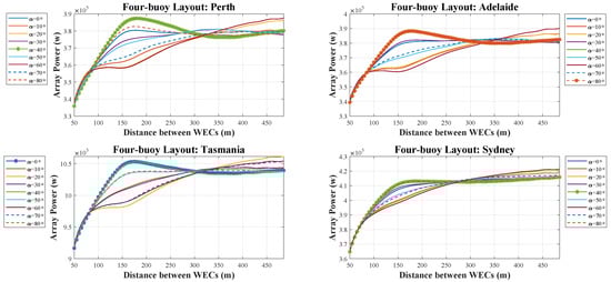 The geometry chosen for four converters is a square shape. values in this layout range from 0 to 80 degrees with 10-degree intervals. The highest harnessed array power is 1.05 Mw in Tasmania, while the lowest one observed in the Perth layout is around 0.387 Mw. Turning to the rotation angle, for Perth and Sydney, the angle is 40 degrees to extract the maximum average array power; however, for Tasmania and Adelaide, is 0 and 80 degrees in order of appearance. Considering the distances between WECs, it is interesting that where the buoy-buoy distance is between 150 and 200 m, the maximum wave array power can be exploited in Perth, Adelaide, and Tasmania. However, in Sydney, it seems that in this , the array power evens off after reaching the highest amount. Hence, the minimum distance between WECs is more cost beneficial for considering layout design 160 m of distance takes into account. In contrast, in Adelaide and Tasmania, a 160 or 170-m distance seems to be the best distance between converters. This amount is a bit greater in Perth, where the highest array power is firstly seen in the 180-m distance (Figure 6).