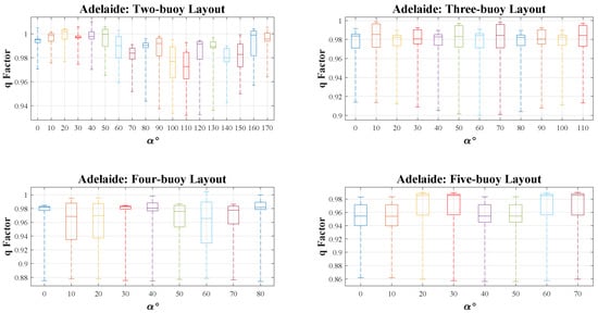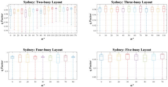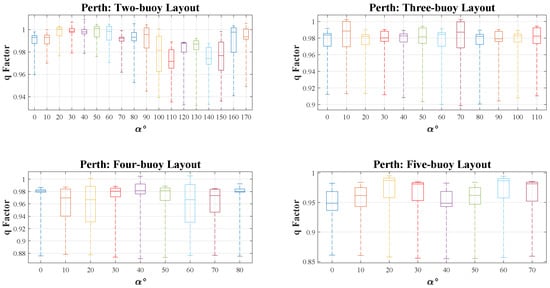 Looking at Sydney in Figure 11, in the two-buoy layout, it is evident that maximum q-factors happen when is either between 110 and 120 degrees or 130 and 140. One of the distinctions compared to the mentioned locations is that the lowest q-factor is seen at 40 degrees. In the three-buoy and four-buoy layout, the average q-factor in each is around 0.98 and 0.97, respectively, and its changes are not recognizable in all 12 tested angles. The q-factors in the five-buoy layout ranged from 0.84 to 0.98. The closest q-factor values to 1 are found at 10 and 50 degrees. Moreover, it can be inferred that when is 30 or 70 degrees, the related q-factors are near 0.98. These results would help further feasibility studies of the WECs’ array analysis by presenting the possible range of achievable q-factors in Perth, Adelaide, Tasmania, and Sydney ports.