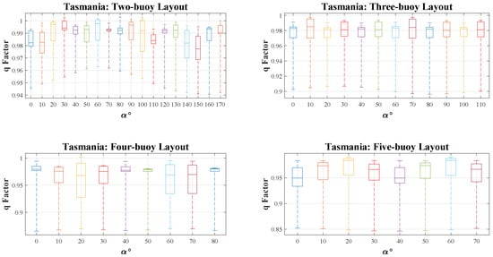 In Tasmania, due to the symmetry between WECs and small effects of changing in q-factor for the three-buoy and five-buoy layout, changes are not considerable. The average q-factor in each rotation angle is approximately 0.98 and 0.96, respectively. When is between 40 and 90 degrees in the two-buoy layout, q-factors in each distance are between 0.95 and 1.005. The maximum averaged array power occurs at 20 degrees. In the four-buoy layout, maximum q-factors are observed in four rotation angles, which are 0, 20, 40, and 60 degrees. Further details can be found in Figure 10.