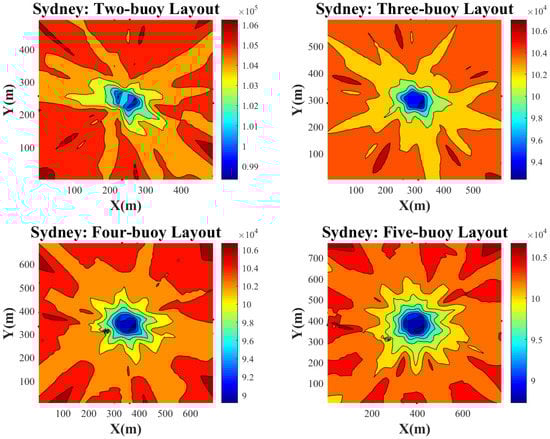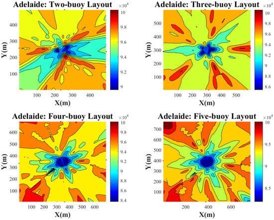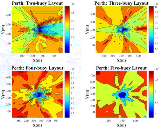 Figure 12, Figure 13, Figure 14 and Figure 15 reveal the power for each buoy in four different layouts. Overall, it is inferred that the asymmetry in arrays makes the power more predictable in each distance and rotation angle. The illustrated plots in this section indicate four kinds of buoy layout for each area in Adelaide, Tasmania, Sydney, and Perth. For each layout, the Colour-bar presents the amount of total power per buoy. This amount has been shown in the form of a contour. In general, there is a similar pattern for studied locations by considering the configuration of the arrays. The maximum amount of extracted energy is more likely to be found in the 5-buoy layout. Moreover, the power of each converter in the center area is not considerable, and the maximum amounts of the exploited energy found for higher buoy-buoy distances. The asymmetry of these energy distributions is high as well, but Perth is an exception. To observe abrupt changes, an increase in the resolution of distance and angles are needed. Take the 2-buoy layout in Adelaide as another example of non-asymmetric layout; the distribution of the incident waves over different angles implied such non-asymmetric contour of exploited energy. The reason behind the asymmetry in other layouts would be that by increasing the number of buoys, possible shadowing effects proportional to each rotation angle occur in every layout. In some placements of the 2-buoy layout, as the array experiences different rotation angles, the buoys may see the same dominant wave direction; however, in some angles, the shadowing effect of one buoy over the other can play a crucial role in reducing the energy. This shadowing effect of buoys to each other becomes more drastic, as the number of buoys increases because, in each angle, there is more chance of interaction between at least two buoys. To describe blue spots it should be noted that in this research, the minimum separation between buoys is considered to be 50 m. Then, by assessing the different angles, the configuration of the array rotates over the center point, such that the lowest amounts of energy may be witnessed in the middle of the figures by interpolation.