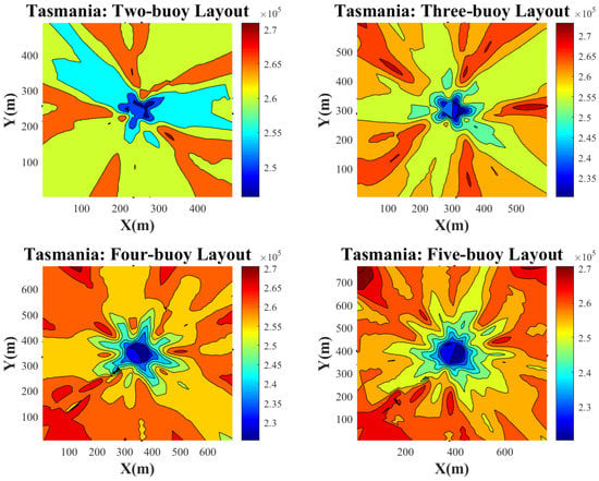 The highest amount of power can be exploited from converters in Tasmania, which is obvious in Figure 15. Although seemingly green areas in the two-buoy layout cover the majority of the zone, the power that belongs to the green areas is very close to the other layouts of the orange ones. The chance of extracting over 0.27 Mw power is seen in the five-buoy and four-buoy layouts. It is worth considering the three-buoy layout power when the x axis is over 250 m, which reveals the potential of this layout under certain conditions. Likewise, when the y axis is less than 150 or more than 350, this potential is met.