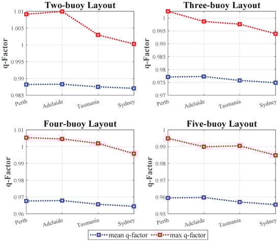 Figure 16 shows the maximum and mean value of the q-factors in a given number of buoys in each wave model. The most significant observations inferred from Figure 16 are addressed as follows. The maximum q-factor in Tasmania and Sydney is less than in the other locations because of the lack of constructive interactions to compare to the other layouts. The mean q-factors are also higher in Perth and Adelaide in all locations for the same reason. Turning to the maximum q-factor, it is apparent that the highest constructive interactions in the two-buoy layout occur in Adelaide. However, in Sydney’s wave scenario, installing buoys, whether separately or in an array, is almost the same because the q-factor equals 1 in the best-case scenario. Although this amount is over 1 in all locations of the four buoy layout, Sydney is an exception. In the three-buoy layout and five-buoy layout, only the q-factor of Perth is more than 1. It is worth considering that the latter has the least maximum q-factor. These results confirm results from previous studies on the decrease of q-factor after increasing the number of WECs arrays, specifically after incorporating more than five buoys [54]. Turning to the mean q-factor, it is evident that by increasing the number of buoys, this variable decreases, and a reduction of almost 0.07 is seen by adding a buoy. Also, this measure is observed to be a trend because constructive interactions are more likely to be seen in Perth and Adelaide. These interactions will occur if the , buoy-buoy distance, and the geometry of layout are appropriately chosen.