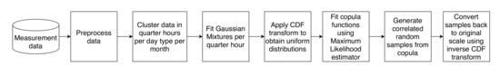 The different steps in the modeling methodology are detailed in Figure 1. In the first step, the measurement data are structured and preprocessed to remove missing values. Then, the data are clustered by quarter hour of the day, per day type (week or weekend), and per month. Consequently, GMMs are fit to model the marginal distribution of each quarter hour. The data are then transformed to uniform distributions using the CDF transform as in [25], and a copula is fit to the multivariate uniform distribution. To generate profiles first samples are generated from the copula functions, which are then converted back to the original scale of the marginal distributions using the inverse CDF transform.