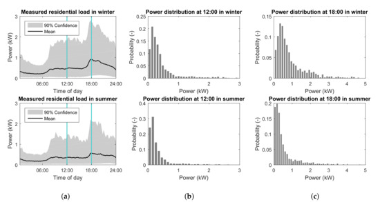 To analyze and model the statistical behavior the measurements are first clustered into groups, based on time of day, day type (week or weekend day) and month of the year. This partitioning is based on the seasonality of the load and time of use behavior of residential consumers [7,29]. Each cluster now consists of all measurements for all households for all week or weekend days in a specific month at a specific 15-min time interval (e.g., the time interval of 12:00–12:15 h for all weekend days in June). This results in 12 months × 2 day types × 96 quarters = 2304 clusters with each around 1700 and 700 measurements for week and weekend days, respectively. Figure 2 illustrates the behavior of the residential load over time and the stochastic variation at specific time instants. The mean profiles in Figure 2a show a clear daily cycle, with a peak at 18:00 h of approximately 0.9 kW in the winter and 0.5 kW in summer. The wide confidence interval around the mean indicates a large spread in individual load values, which is displayed in more detail in Figure 2b,c, which shows the distribution of the load at two chosen 15-min intervals.