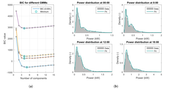 First, GMMs are fit to the measurement data to obtain the marginal distributions of each individual quarter of an hour. The optimal number of components of each GMM is selected by evaluating at what number the Bayesian Information Criterion (BIC) is minimal. Figure 3a shows the evaluation of the BIC for GMMs with an increasing number of components, for several quarter of an hours in January. For all clusters, the optimal number of components varies between 3 and 7 components. Figure 3b show the fit of four of the mixture models to their respective data by comparing the probability density function (PDF) of the GMM to the measured data, indicating a good fit and showing no signs of overfitting. CRPS values of the different clusters are also low, 0.01 kW on average, ranging from 0.002 to 0.02 kW.