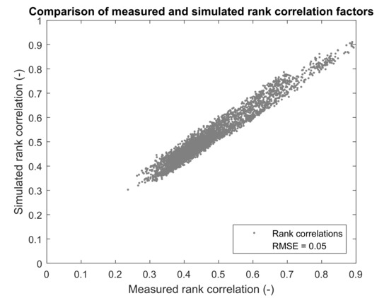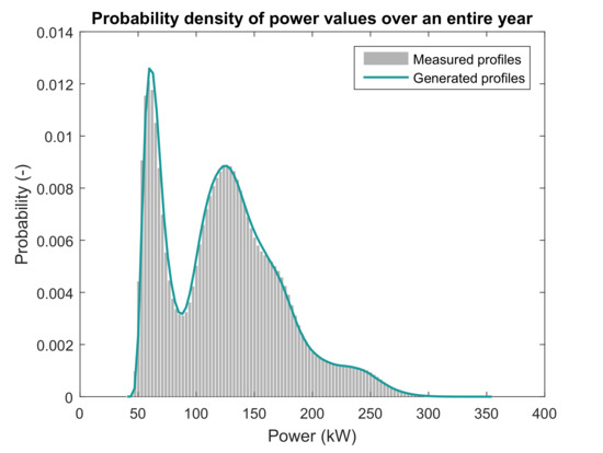 Profiles can be now generated which represent the statistical behavior and correlations present in the original dataset. Figure 4 shows a comparison of measured and generated profiles for 30 and 300 random household profiles for four days in January. By visual inspection, the model appears to represent the time behavior and peak load well. The probability density distribution of the load for a full year is shown in Figure 5, indicating a proper capture of the stochastic yearly behavior by the model. Further, the correlation factors between quarters of an hour of the measured and modeled profiles are compared in Figure 6, again demonstrating a good representation of these correlations by the model with a root mean squared error (RMSE) of 0.05.