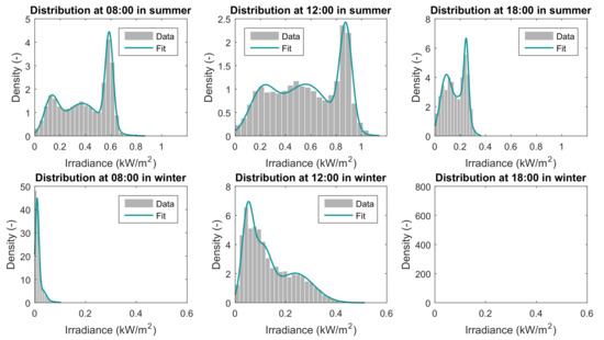 The modeling of the irradiance profiles is based on measurements of the solar irradiance for a period of 10 years from four weather stations in the Netherlands, obtained from the openly available meteorological data of the Dutch Royal Meteorological Institute (KNMI) [32]. The data is clustered per 15-min interval of the day for each specific month (the distinction between week and weekend days is obviously not made), resulting in 12 months × 96 quarters = 1152 clusters with each around 1300 measurements. Figure 7 shows the fit of six mixture models to their respective data clusters for morning, noon, and evening clusters in January and June.