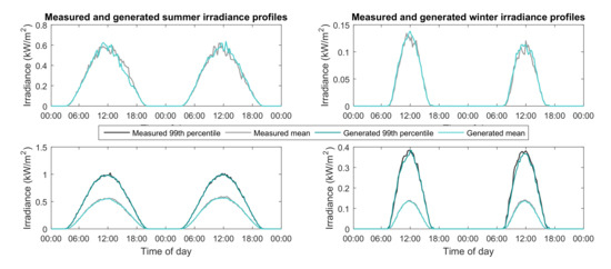 By sampling values from the copula functions and transforming these back using the GMMs, stochastic irradiance profiles can be generated. Figure 8 shows a comparison of averaged measured and generated profiles of 30 and 300 random two day profiles in summer and winter, indicating the model closely represents the measured profiles. The respective RMSPE values of the summer and winter profiles are 2.9% and 5.3%.