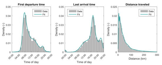 PDFs of data and fitted mixture models for first departure time, last home arrival time, and cumulative distance traveled.