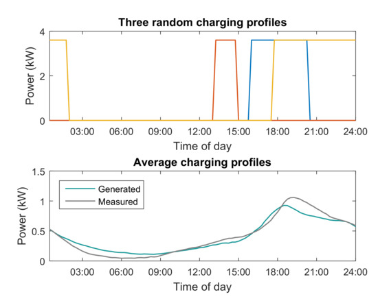 By sampling from the fitted copula functions and applying the previously described transformation, combinations of departure time, arrival time, and travel distance are generated. Using the average efficiency of currently available electric vehicles, the power consumption while driving is assumed to be 6 km/kWh [36]. Given the available information on traveled distance, the total required energy each trip is calculated. These energies are then converted in profiles by assuming a charge rate of 3.6 kW, which corresponds to the single phase residential charge power. With the final assumption that people start charging their car at full power at the time they arrive at home, representative charging profiles have been be generated. Figure 10 shows individual and aggregated profiles for residential EV charging. The average charging duration is roughly 2.5 h, which aligns with the average travel distance of 54 km. The bottom graph shows a comparison of the average simulated charging profiles to the average of measured profiles from a dataset provided by ElaadNL. This dataset contains measurements EV charging at 428 (semi-)public charging stations in the Netherlands for a full year in 2017. From this dataset, the charging stations which are located in residential areas and that did not show charging peak in the morning (to exclude charging when arriving at work) were selected for comparison; furthermore, the set was filtered to include only day profiles with at least one charging session. Overall, the general shape of the profiles is similar; however, the simulated profile has a lower peak, which also occurs a bit earlier in the day compared to the measured profile. The differences may be related to the fact that the measured profiles are from (semi-)public charging stations, and not from actual residential consumer connections, this might cause a different charging behavior at individual stations. For instance, as the charging stations are in the public space multiple cars may connect on a single day, for usually shorter charging duration, and some stations are less regularly used than would be expected for a private residential charging station. Moreover, the driving behavior of the average EV driver in the recent past would not necessarily resemble the the average overall driving behavior of the current Dutch car fleet, e.g., the difference in peak suggests that on average current EV drivers arrive at home a bit later than the overall average driver.