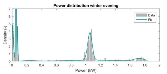 In Figure 11, the PDF of the electric load of a heat pump is shown for evening time in winter. Three distinct peaks can be discerned, signifying the three general states of operation of the heat pump: off, room heating/cooling, and tap water heating. During the off-state, a small amount of power is still being used to keep the water flowing through the system. The other two peaks occur around the compressor steps of the heat pump, the variance being caused by the change of operation state during the measured 15-min intervals.