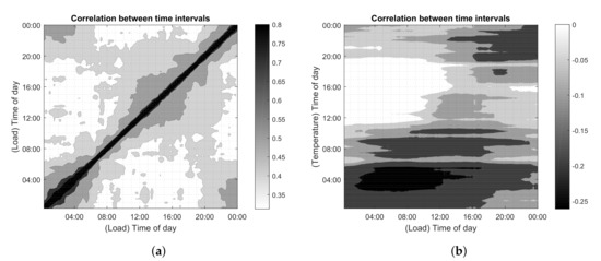 Correlation of power consumption at different time intervals, with darker shading indicating a larger magnitude of the correlation factor. (a) Autocorrelation of electric load and (b) correlation of load with temperature.