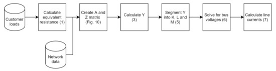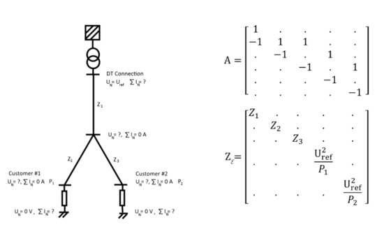 This section introduces a linear network model which is suitable to evaluate very large low voltage distribution networks [38,39]. Contrary to the models presented in the previous section, the proposed load flow approach is deterministic. Therefore, a Monte Carlo approach is applied to simulate the impact of the stochastic peak loads. The general load flow modeling approach is displayed in Figure 14 and is described more thoroughly in [38,39], where also its accuracy is assessed on a test bed. Additionally, high-efficiency solvers for this load flow formulation are considered in [40,41].
