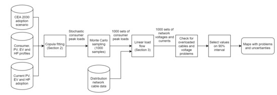 In accordance to the diagram in Figure 16, the numbers of the CEA scenario are applied to the copula models described in Section 2 resulting in stochastic load profiles for every consumer. These load profiles were sampled using a Monte Carlo approach, resulting in a set of customer peak loads. Each set of peak loads was evaluated using the linear load flow model from Section 4, following the diagram presented in Figure 14.