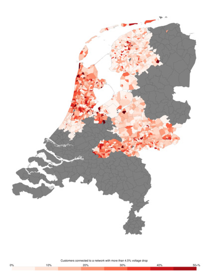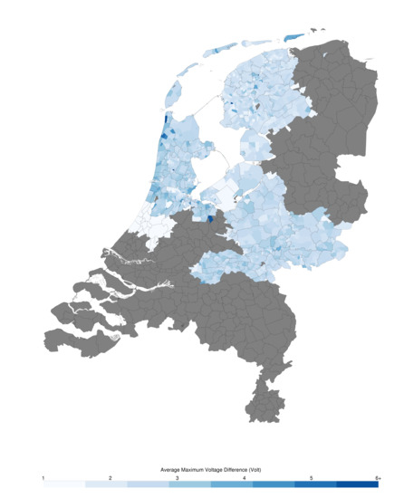 Figure 17 shows the geographical distribution of the load and the voltage and current problems. It can be observed that some areas in the Netherlands are expected to have much more voltage problems than others. The west of the Netherlands has the oldest network and is the most densely populated. It is not surprising that most voltage problems are expected in this area. Because Monte Carlo methods can produce outliers, the top and bottom 5% of the voltages have been filtered from the results, creating a confidence interval of 90%.