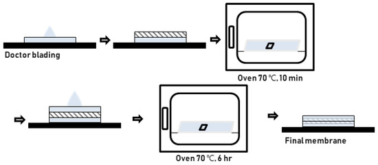 Reinforced composite membranes were prepared by hydrophilized PTFE substrates and D1021 Nafion™ dispersion (EW 1100, 10 wt.%, Chemours). As shown in Figure 1, the hydrophilically treated porous substrate provides better wettability for the Nafion™ dispersion. However, the untreated pristine one completely repels the dispersion of the substrate surface. The procedure consists of six steps as follows: (1) the PTFE substrates were immersed into the dispersion for 5 min; (2) the membranes were placed on a glass plate doctor-bladed by a film applicator with a thickness of 10 μm; (3) the membranes were dried in a convective oven at 70 °C for 10 min; (4) another 10 μm-layer Nafion was coated on another side of the membranes; (5) the membranes were dried again in a vacuum oven at 70 °C for 6 h; (6) finally the membranes were annealed in a convective oven at 190 °C for 12 min. The scheme of the preparation is illustrated in Figure 2. All the composite membranes were boiled in a 0.5 M H2SO4 solution for 6 h for protonation and boiled in distilled water for 6 h for removal of residual acid prior to use.