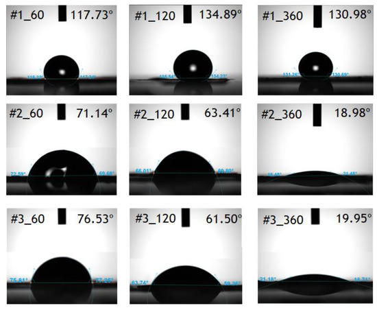 The contact angle of the surface of the porous PTFE substrate (Zeus) treated by GA and APTES (#1) at the first row, GA and TMPEDA (#2) at the second row, and GA and TMPDETA (#3) at the third row with the incubation time of 60, 120, and 360 min from the left-hand side, respectively.