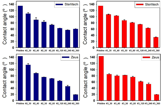 Change of contact angle of the surface of the porous PTFE substrate treated by GA and TMPEDA (#2) at the left-hand side (blue) and GA and TMPDETA (#3) at the right-hand side (red) with incubation time and the type of substrates (Sterlitech in the top row and Zeus in the bottom row).