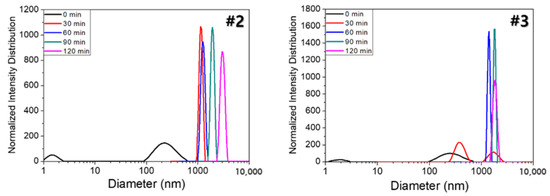 A dynamic light scattering of the GA/#2 (left) and GA/#3 (right) with incubation time.