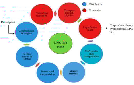 Figure 2 depicts a schematic diagram of the LNG life cycle. With the help of the pipeline extracted raw natural gas is sent to the plant for liquefaction, where LNG is obtained as a byproduct. Mainly, the ship is used to carry LNG to the regasification terminal. Meanwhile, a small amount of liquid is drawn off and carried by small tanker trucks to the service station for fuelling LNG trucks. On the other hand, in each transport and storage, phase boil-off gas is produced, which can be fully recovered for the purpose of using as a gaseous fuel [].