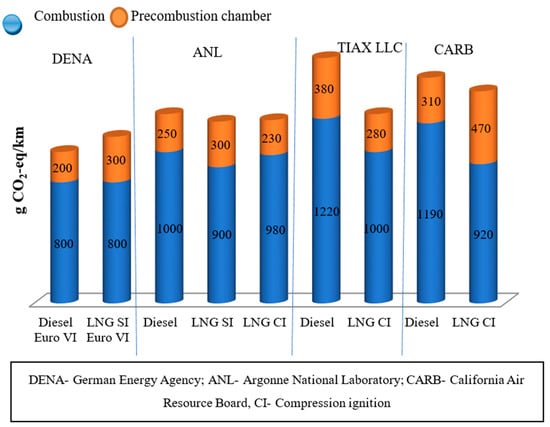 From a long time, natural gas has been used as fuel for private cars. Heavy vehicles such as heavy trucks and buses are also using natural gas recently. Pressure vessel stores natural gas at very high pressure of about 20 MPa. In the transport sectors, natural gas shows numerous benefits, especially where heavy fuels are utilized []. Almost 25% CO2 [], 85% NOx [], 98% SOx [] and 90% particulate matters [] are reduced during combustion of the engine when natural gas is used in place of diesel fuel. Shortly, heavy fuels containing sulphur will be severely restricted; thus, Western Europe has a considerable interest to use LNG for ship propulsion []. Worldwide share of ship emissions to total emissions is increasing day by day. Ship emission produces SO2, CO2 and NOX, which contributes 4–8%, 2–4% and 10–20% of global emissions, respectively []. In the gas-burning mode, LNG vessels result in the elimination of all SO2 emission and the production of NOX, CO2 and particulate matter are less compared to a vessel driven by marine diesel []. Generally, the greenhouse gas emission of a diesel truck is higher than the LNG truck in the wheel to wheel (WTW) analysis. Figure 3 shows a particularity of source of origin of tank to wheel (TTW) emission factors, where DENA extricated the information from German Consultancy-Ludwig Bölkow Systemtechnik (LBST) and the rest of the sources are from North American experiments []. From Figure 4, it can be seen that the total WTW emissions of all gas heavy ground vehicles (HGVs) are significantly lower than diesel HGVs and LNG shows way better results in terms of emissions than CNG and diesel. Besides, the reduction of emission, LNG provides other competitive advantages in night-time services through inner-city by reducing the noise level when using LNG Otto-cycle engines [].